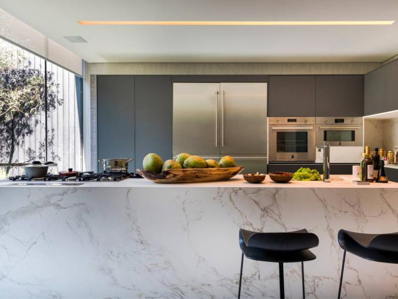 João Armentano, na Villa Olivo Todeschini, aposta em luminosidade natural e ventilação abundantes pelos grandes caixilhos de vidro pivotante. No mobiliário, poltronas e cadeiras quebram a formalidade, com um layout solto e diversos estilos e tempos em diálogo. Na cozinha, a bancada central, em Dekton Entzo é o grande destaque.