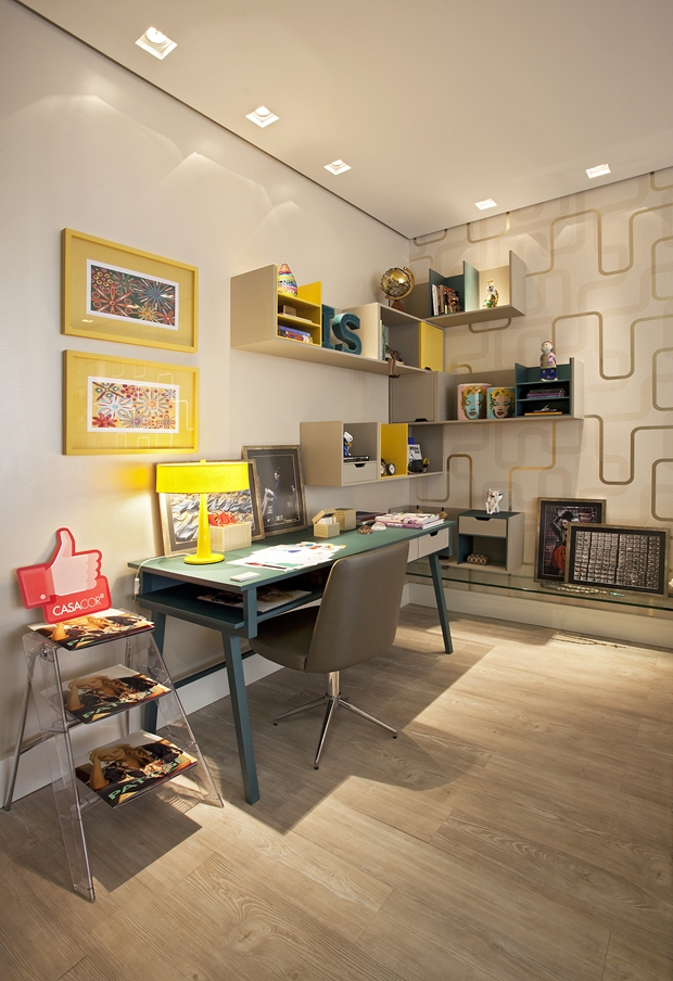 A designer de interiores Iara Santos também possui trabalhos em que a escada foi utilizada de forma bastante criativa. Em um de seus projetos ela lançou mão desse objeto para fazer as vezes de um mini revisteiro. Uma ideia ousada que resultou em um móvel charmoso e prático.
