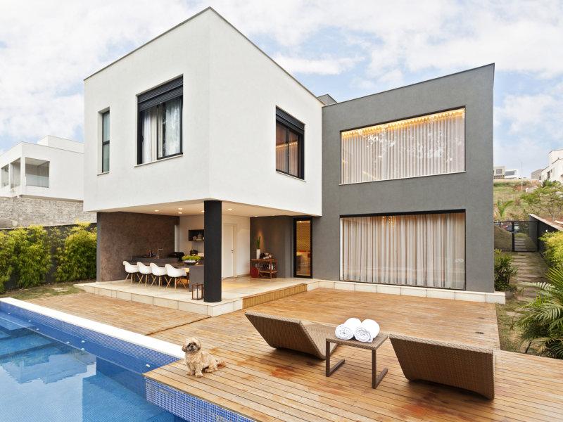 Projeto Óbvio Arquitetura: O deck de madeira suspenso dá destaque ao mobiliário contemporâneo da área da piscina. Foto: Henrique Queiroga