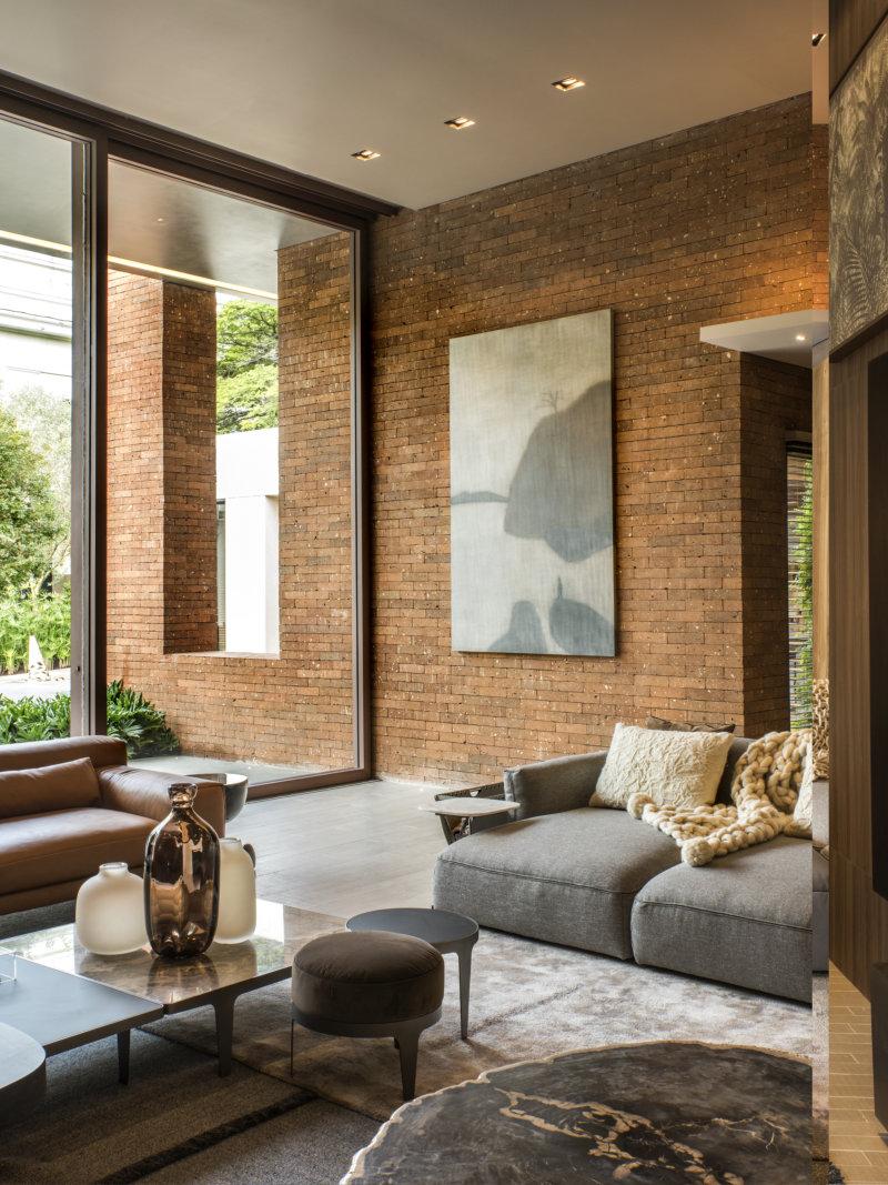 Reunidos num único e amplo ambiente, o living com lareira e a cozinha gourmet estão sempre conectados ao gostoso jardim de 118 m² graças aos generosos panos transparentes de vidro. “Usamos caixilhos de alumínio, linha FEAL Slim 120, com acabamento no tom cobre, ambos lançamentos da Tecnofeal, que compõem as três portas de correr com o maior vidro jumbo brasileiro. Cada um mede 4,30 de altura e pesa aproximadamente 350Kg”, explica a arquiteta.