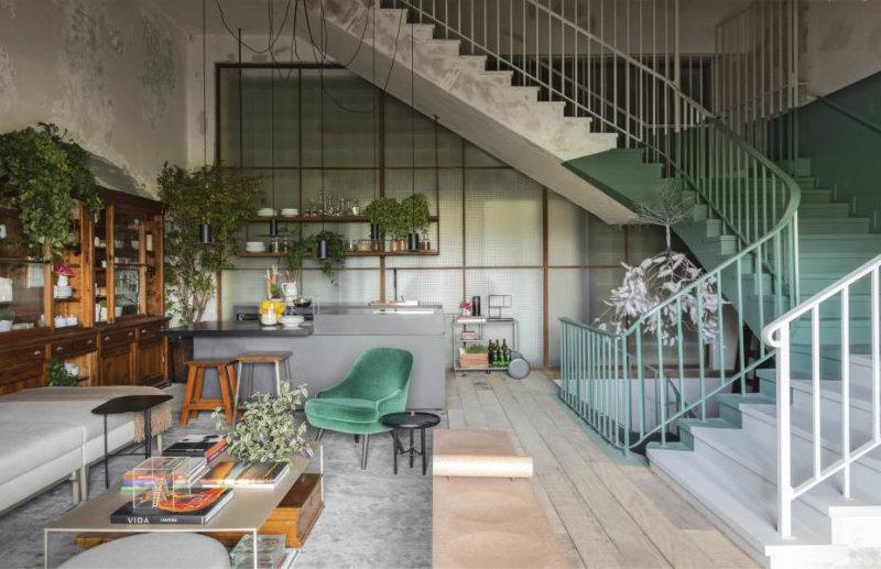 A Triart Arquitetura, criou a Cozinha Matriz, na qual a estética rústica e desgastada da construção original foi ressignificada, produzindo uma atmosfera criativa e convidativa. O mobiliário é eclético e explora a madeira e os tons de verde. Nas escadarias, o color block valoriza as formas e destaca a escultura em formato de árvore, do artista cubano Jorge Mayet.