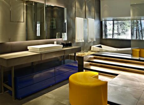 Trata-se de uma sala de banho surpreendente, elegante, formatada com elementos de design clássico combinados entre si para formar uma atmosfera sóbria, porém convidativa para as horas de descanso, reflexão e relaxamento. Contemplando os desejos femininos, foi elaborado ainda um espaço para maquiagem, que garante deixar à mão todos os acessórios femininos necessários. Para este espaço, foi prevista uma luminosidade sem sombras que proporcione uma maquiagem perfeita. Um verdadeiro templo para o bem-estar, relaxamento, intimidade, beleza, conforto, luxo e alta tecnologia.