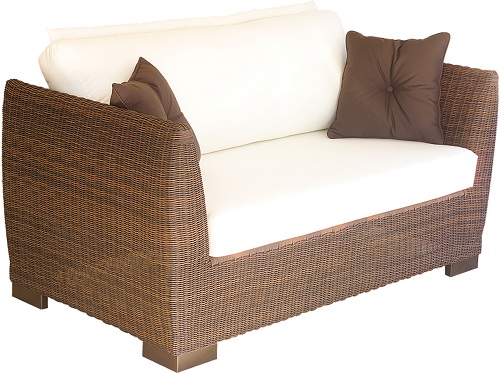 Base revestida em fibra sintética e almofada revestida em tecido próprio para áreas externas