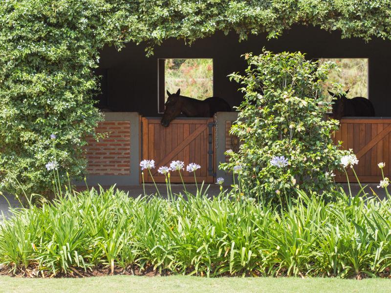 Roberto conduziu trepadeiras pelas colunas das baias durante anos, formando um belo toldo natural que impede a propagação do calor internamente e ainda deixa um cheiro doce, atenuando o odor dos cavalos.