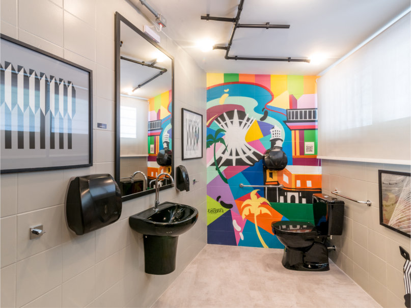 A natureza também se faz presente no "Hall dos banheiros" e pode ser vista na entrada, do acesso aos sanitários, através das paredes emolduradas pela grama sintética, que traz tranquilidade e beleza ao espaço. As divisórias dos banheiros privativos receberam um acabamento muito especial: a arte do grafite pelas mãos do artista brasileiro Roger Taí. Os azulejos existentes foram repintados.